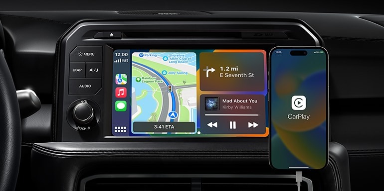 The wingman to your compatible iPhone®. Brings on board your contacts, favorite messaging apps, Apple Music® playlists, Apple Maps, and more.