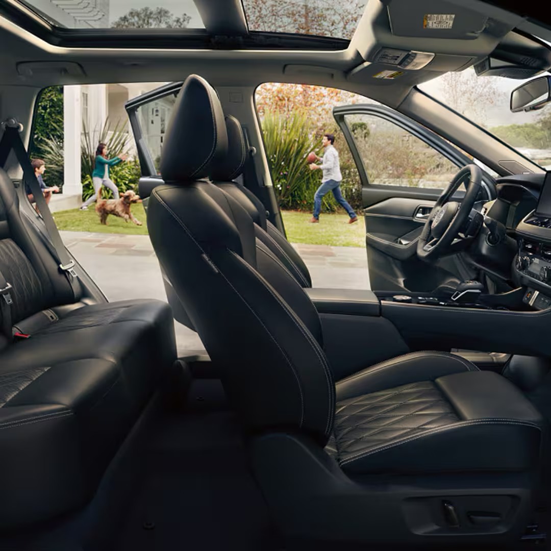 The Nissan Rogue's interior is designed with comfort in mind. It offers more legroom for both front and rear passengers than the Toyota RAV4 does, and its available Zero Gravity seats provide excellent support during long drives. Both SUVs offer available heated front and rear outboard seats, available leather upholstery options, and an available hands-free liftgate. The Rogue takes the convenience a step farther with its remote-folding rear seats, a Divide-N-Hide® cargo system, and a “floating” front console with smart storage (which leaves room for a purse or briefcase to be tucked safely next to your seat).