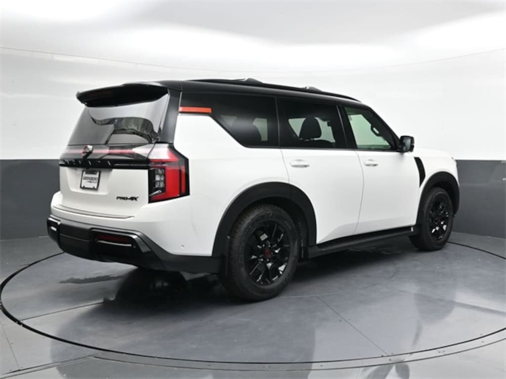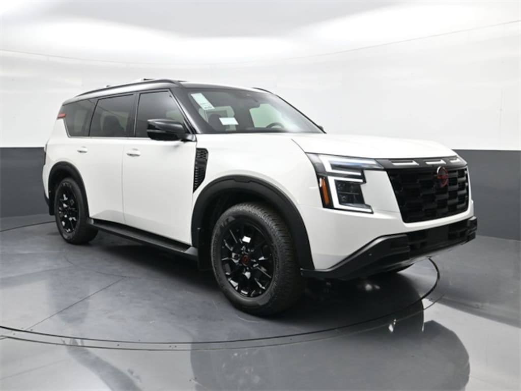 Aspen White Tricoat/Super Black 2025 Nissan Armada PRO-4X 4WD 9-Speed Automatic 3.5L DOHC 4WD, ABS brakes, Active Cruise Control, Alloy wheels, Electronic Stability Control, Front dual zone A/C, Heated door mirrors, Heated Front Bucket Seats, Heated front seats, Illuminated entry, Low tire pressure warning, Navigation System, Power Liftgate, Remote keyless entry, Traction control.
